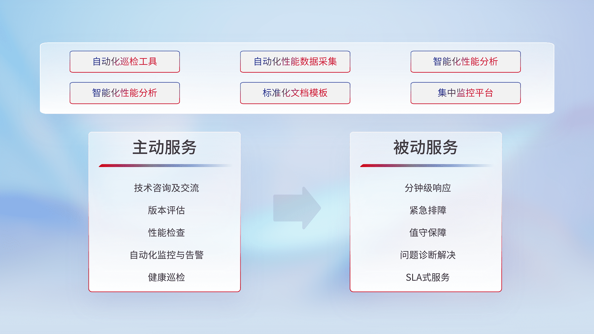 智能化工具和标准化文档,,保障服务质量,,,提供主动服务(包含技术咨询、、版本评估、、、、性能检查、、、自动化监控与告警、、、、健康巡检)和被动服务包含(分钟级响应、、、紧急排障、、、、值守保障、、、问题诊断解决、、、SLA服务)。。。。